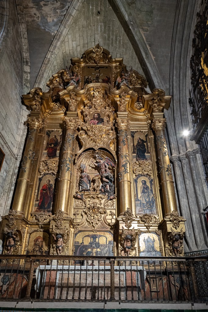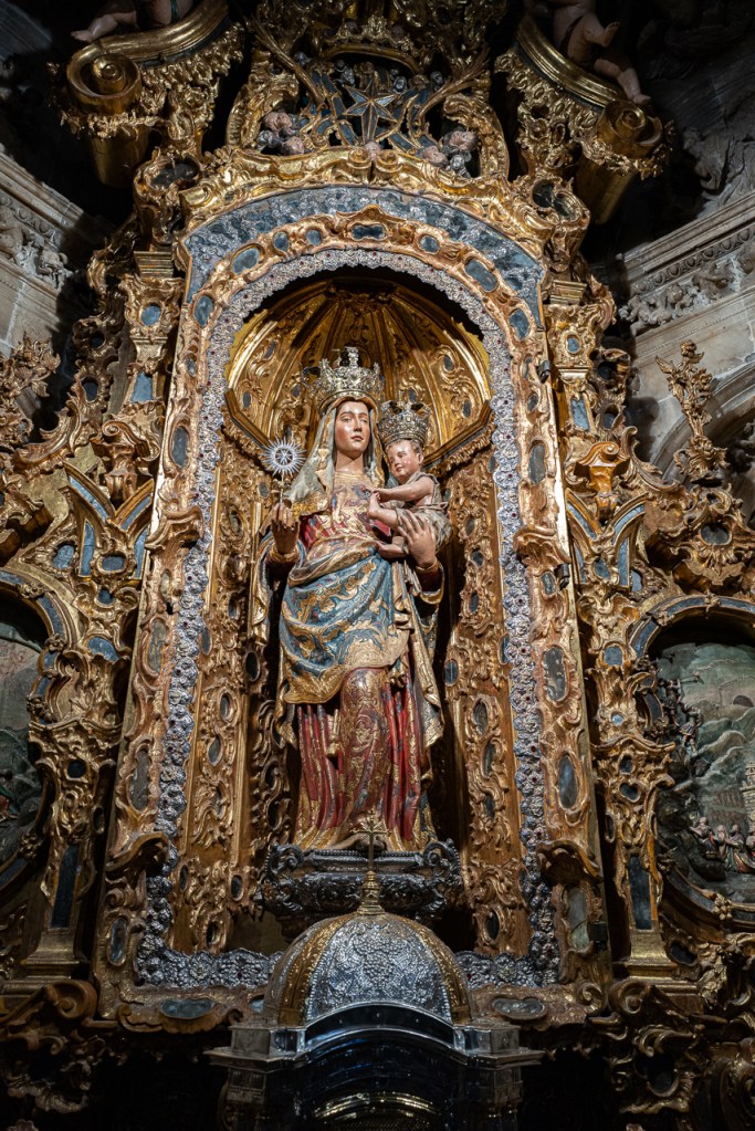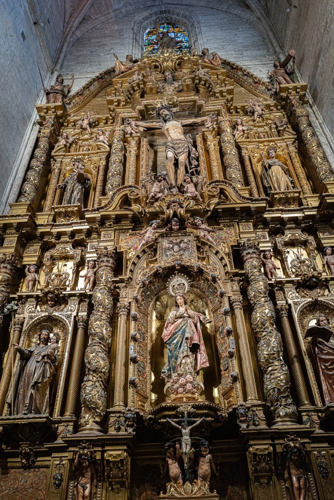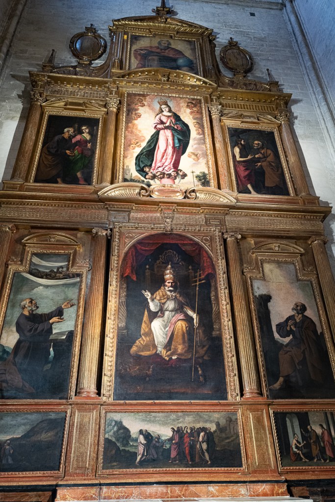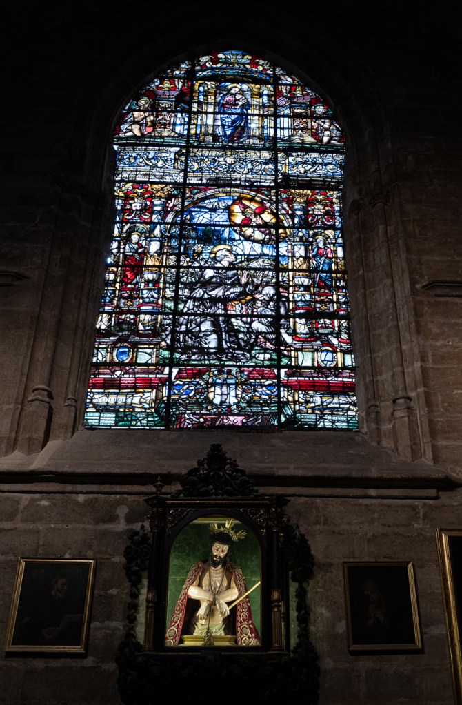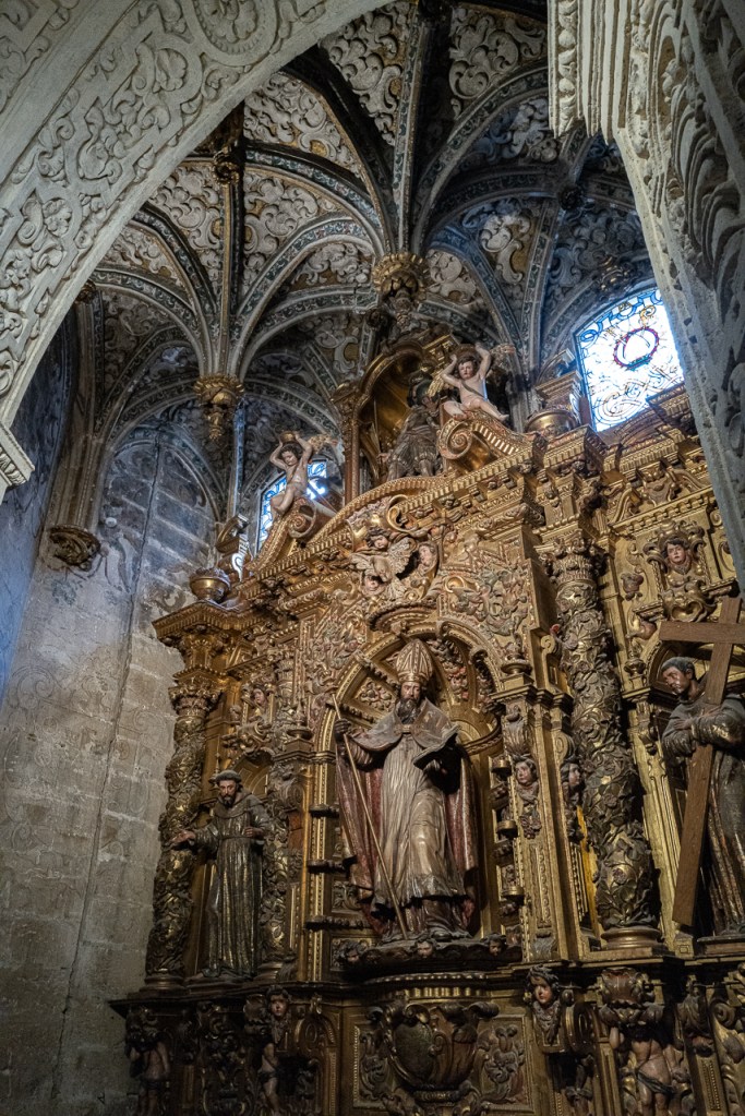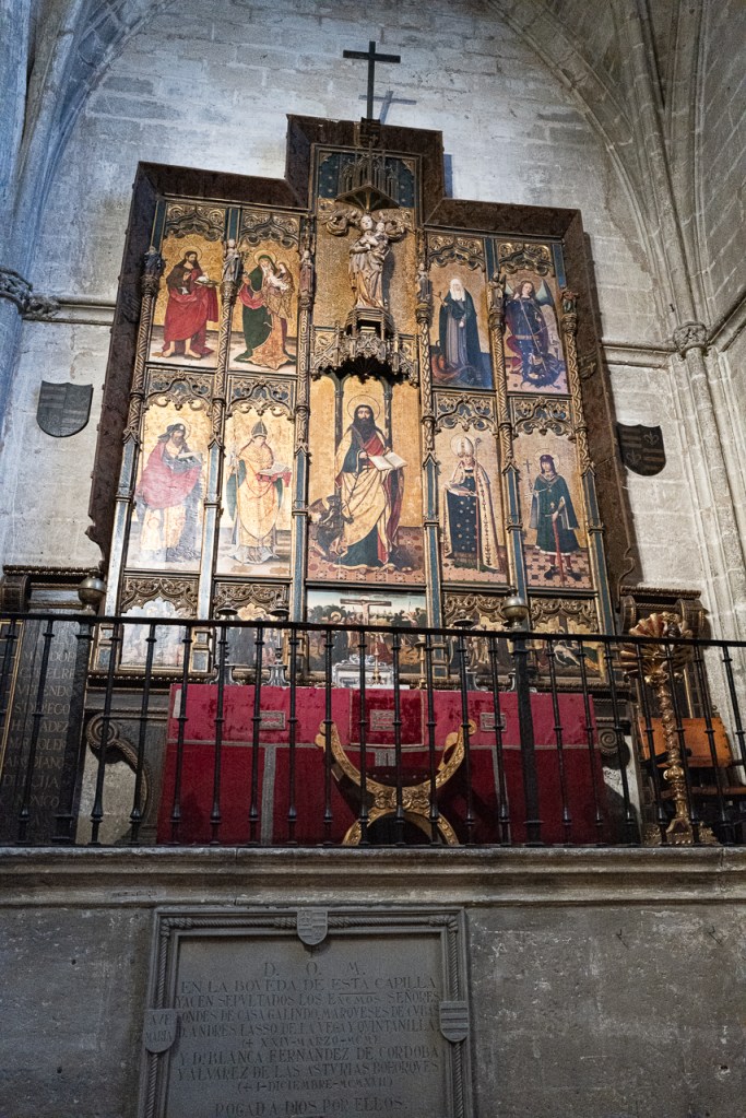 The cathedral is so big, and so full, and so awesome that it’s a lot to absorb, a lesson learned on our two previous visits. We decided to go today for two reasons – first, after coffee, we walked by and the entry line was really short. Second, I was on a mission to see the tomb of Ferdinand III and his “incorruptible corpse,” something I’d previously missed. To make sure that didn’t happen again, we did a very methodical search of the church taking photos and reading the information signs at every single chapel, something that took a solid hour. By the end, we realized we’d missed him again so I walked over to the information desk and asked the gentleman where he was.