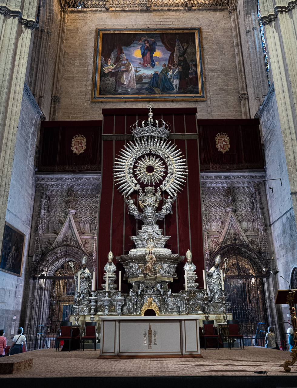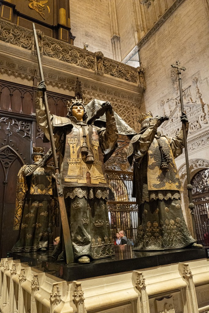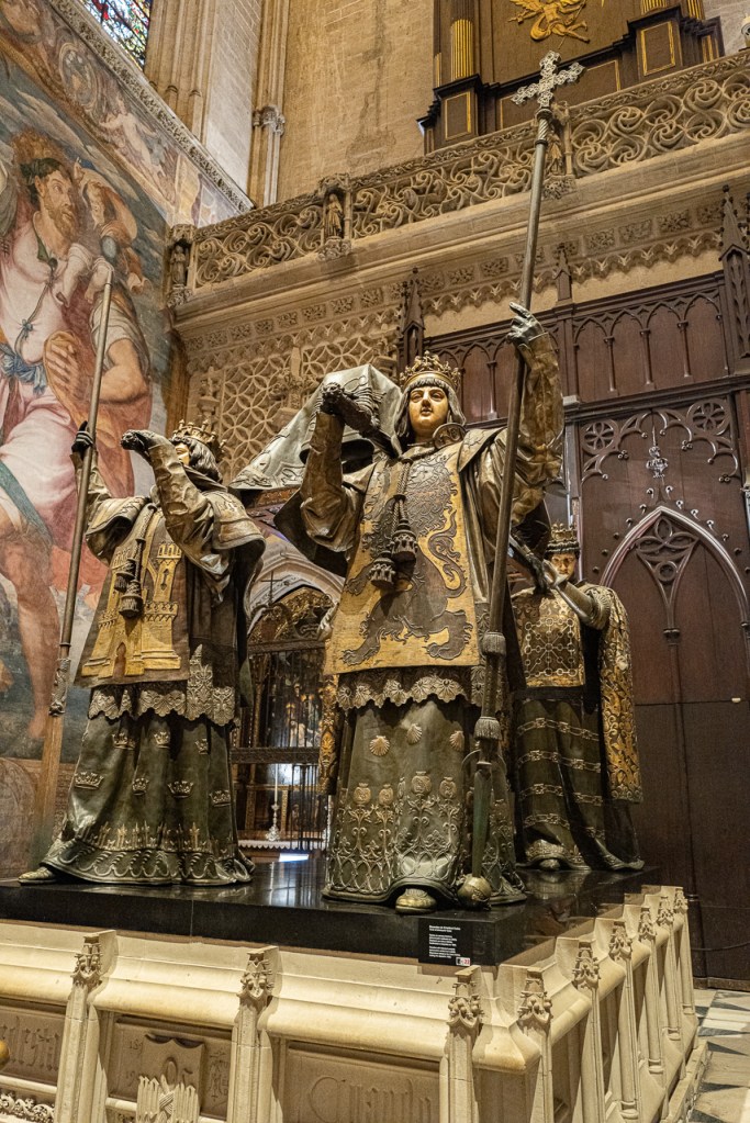 First of all, I was wrong about the king. I said “Felipe” when it was “Ferdinand.” The man said there is no Felipe here. I added, “The Liberator of Sevilla,” he said “No.” Perplexed we sat in a pew and I did a search and discovered it was “Ferdinand,” so I went back and corrected myself. He told me that Ferdinand was in the royal chapel on the far side of the main altar. Off we went, but having already been there, we had our doubts. The was a crypt in that location, but it was devoted to a minor royal family with no kings in sight. I did another search and found a nice photo of the incorruptible corpse so I knew it existed, but we couldn’t find a way into the only locked door we could find. So I went back again and asked and sure enough we got the answer – it was Ferdinand and yes he was in a crypt and that crypt is not open to the public. Something he could have told me on the first stop. Alas, foiled again.