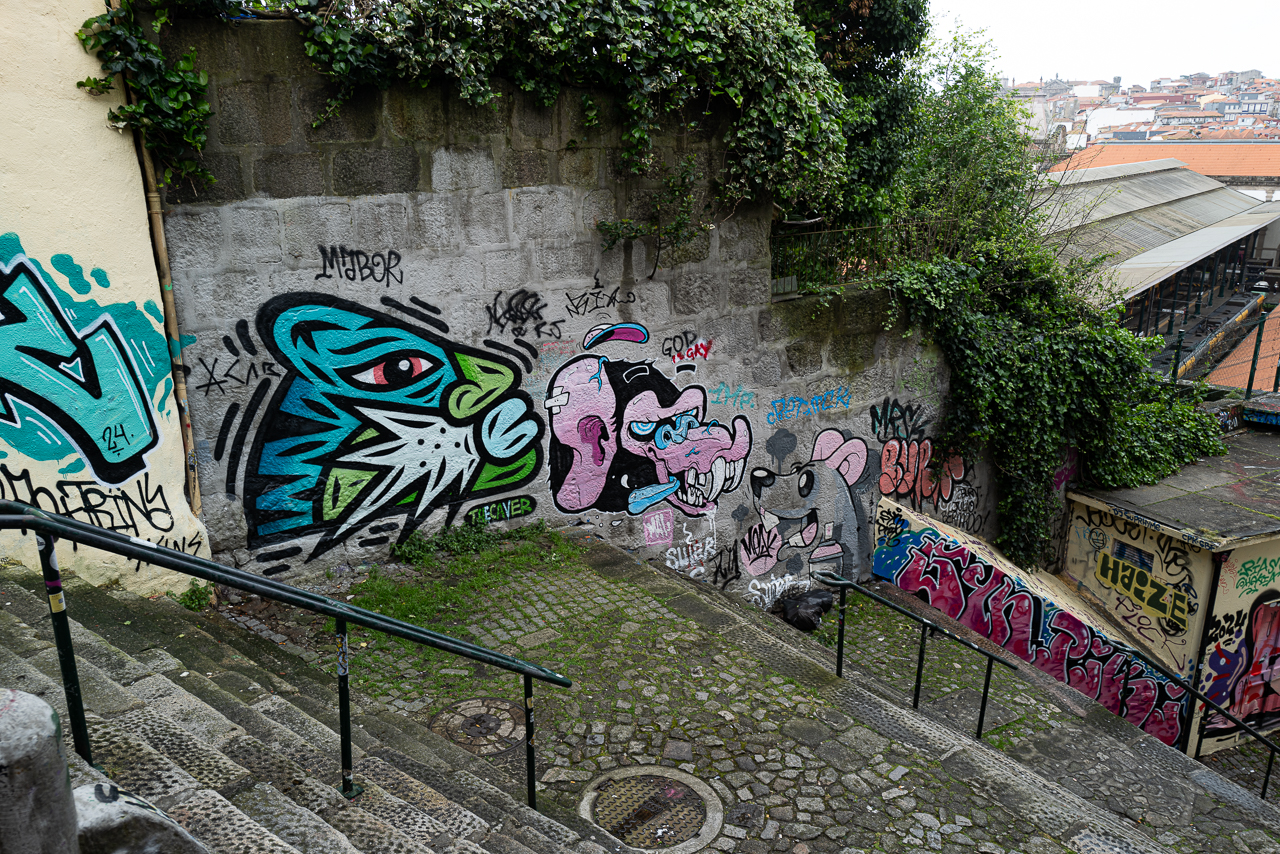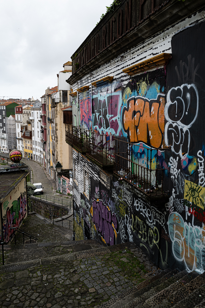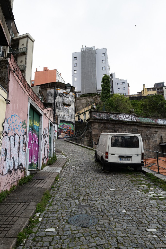 The weather was trending dodgy but the sky had a bit of sun so we thought we’d make our way to Igreja Santo Ildefonso, up the hill (no kidding) and behind the cathedral. Google Maps showed a preposterous route, so much so that it looked nothing like what the physical map showed. Erring on the side of having been burned by technology already on this trip, we left the coffee shop, made our way to São Bento station (cutting through to avoid the torn-up sidewalks,) and went out a back exit in the direction of the church. What came next was the single-worst ascent of our week. A steep cobbled alley (the once car parked along the curb had chocks behind its wheels) followed by a miserably long and winding flight of stairs. I know you’re getting bored hearing these stories, but I assure you we are not wimps and my words are understating our suffering.