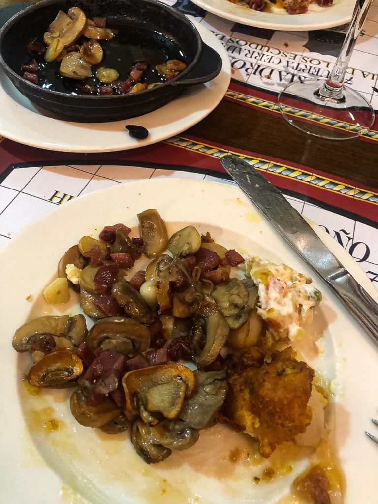 I told the waiter that we’d been there 5 years ago, and that I had missed the Delicias every day since. He loved that story and it set the tone for the rest of the evening. We talked about the wine (Douro again,) and joked about my love of the food. He brought us some Ensalada Russa (literally “Russian Salad,” it’s a common tapa in Spain and it’s nothing more than potato salad with a ton of mayonnaise.) We had some bread, drank some wine, and then the Delicias arrived.
