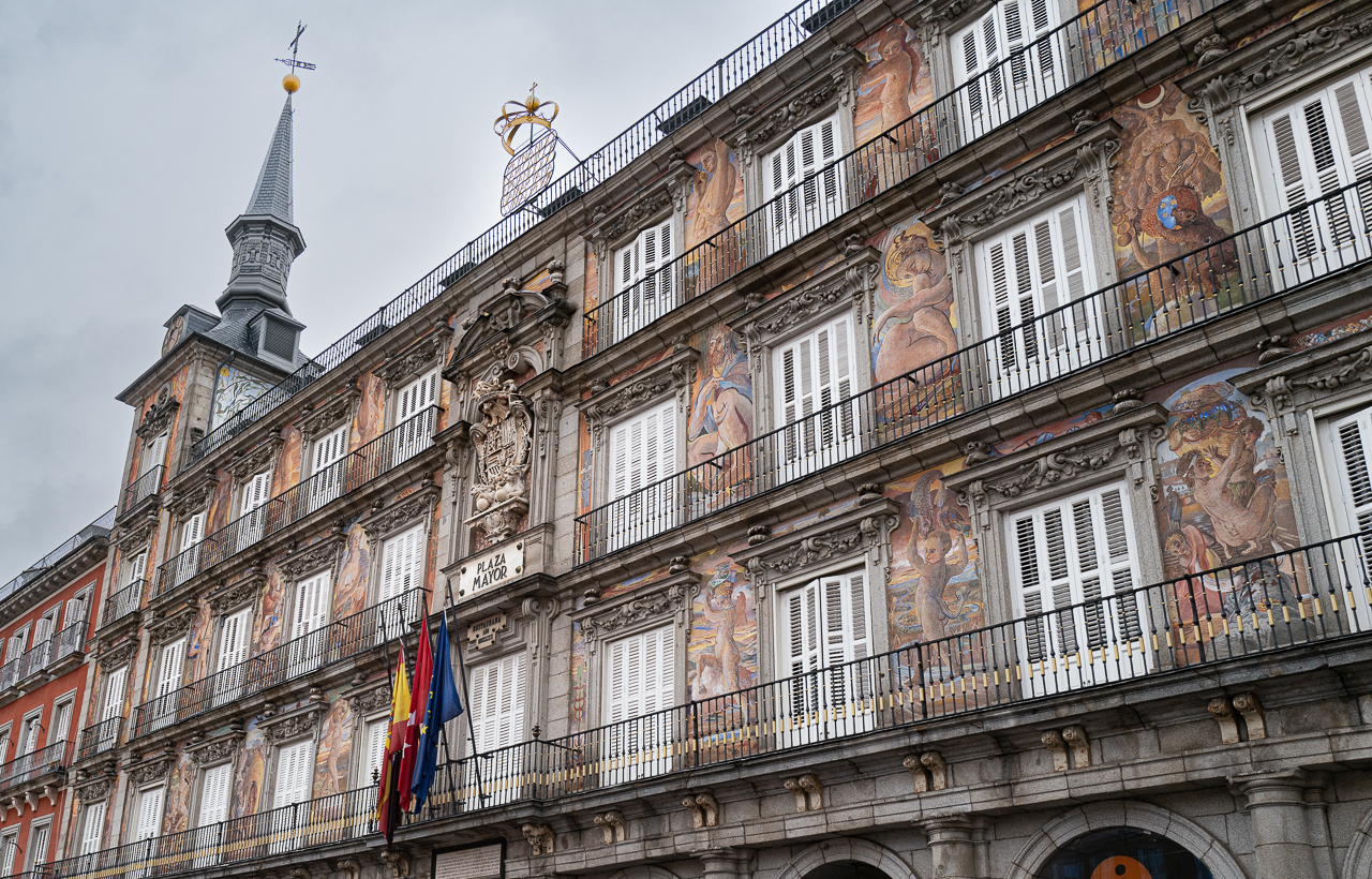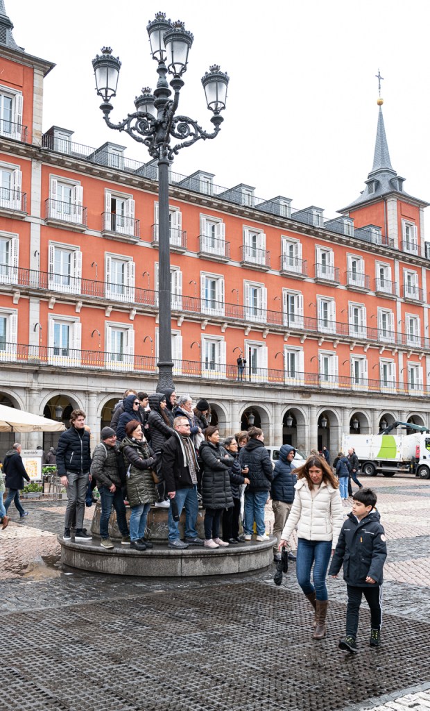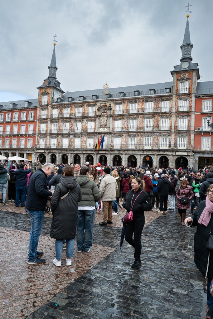 The rain had stopped and Plaza Mayor was crowded. We were able to get within 3 layers of people of the barricade and waited. On the short walk over, we could hear band music in the street as we entered the plaza. A few minutes later, the music reached a crescendo as the band entered through a tunnel at the north end. It was very loud, echoing off the surrounding buildings, and you could feel the bass line straight in your chest. They marched in, 100 strong clad in purple and beating all kinds of drums. They circled the barricaded area and came to a halt. An emcee would talk about something in Spanish followed by the band playing. After a couple of tunes, they rotated 90 degrees and faced us. Again they played a couple of songs and they repeated the process. Once they’d turned completely about, they exited along the same path.