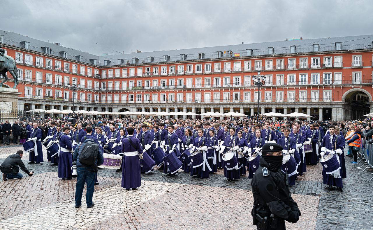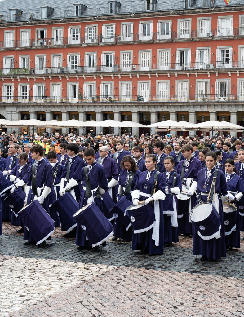 There was one last Semana Santa event that we wanted to see, La Tamborrada. La Tamborrada originated in the north of the county in San Sebastian in the early 1830’s. Its origin is a bit murky, but it’s said to have started with the locals making fun of Napoleon’s troops during the occupation of their city by standing along the roads and beating on cans and buckets to mock the daily military procession. Tambor means “drum” in Spanish and Tamborrada means “the beating of the drums.” Today the San Sebastian Tamborrada is the biggest in the world and takes place during Lent. The tradition has spread to other cities in Spain and the Madrid version celebrates Easter and the end of Semana Santa.