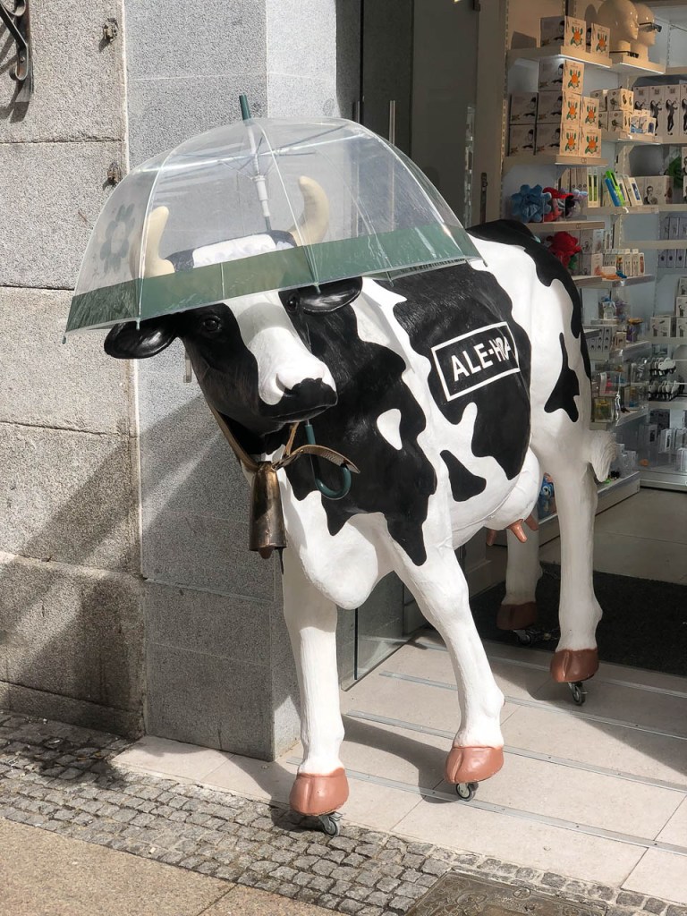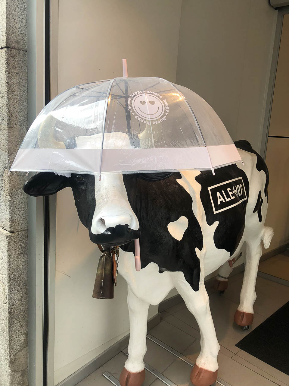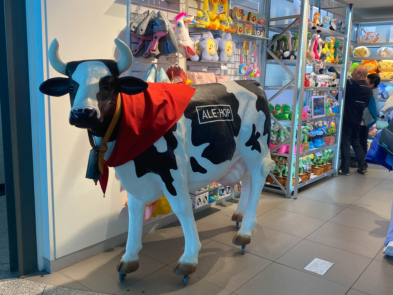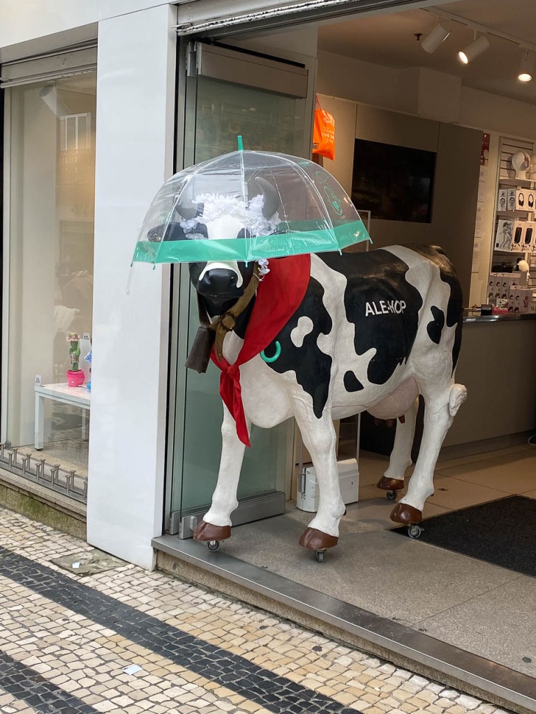 Special for us are the cows. They stand in front of every Alehop, a miscellaneous gizmo store, and are always decked out for the weather and the season.